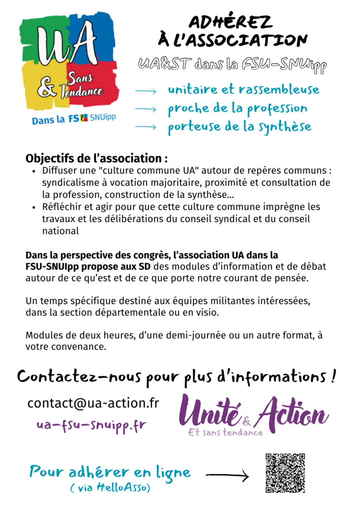 Pour adhérer à UA (Unité et Action) et soutenir le courant dans la FSU-SNUipp, un seul lien :